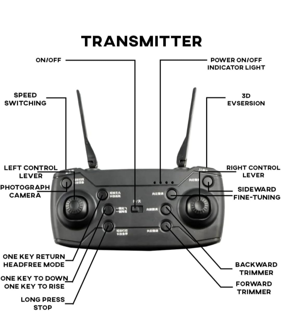- الوظيفة: أعلى/أسفل، إلى الأمام/الخلف، انعطاف إلى اليسار/اليمين، طيران جانبي، ضوء LED، كاميرا 4K، مفتاح واحد للإقلاع/الهبوط/العودة، وضع تثبيت الارتفاع، وضع بدون رأس، WiFi FPV، جيروسكوب ثلاثي الأبعاد والتحكم في التردد 2.4 جيجا هرتز.